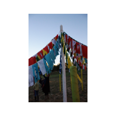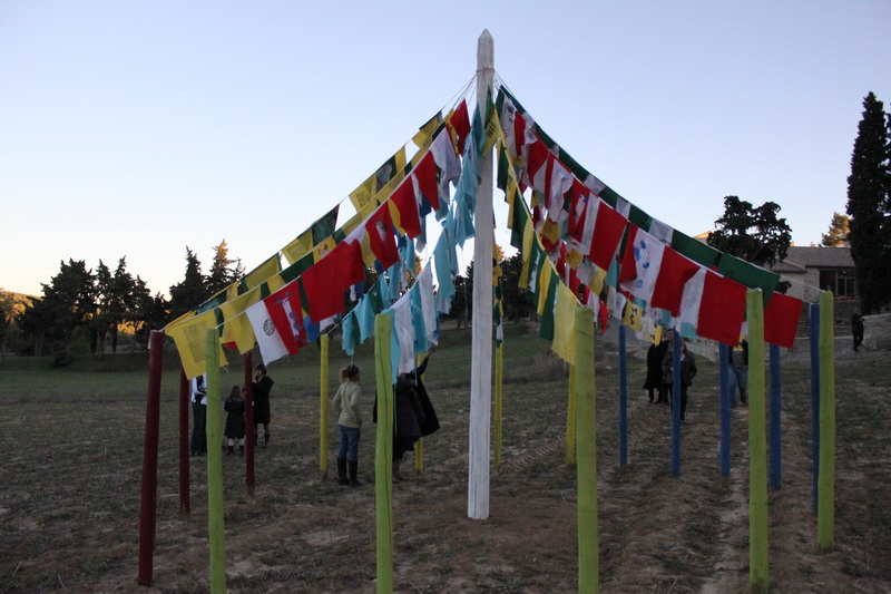 Florence Bouvry crée une yourte "temple" dédiée à l'écoute des mémoires languedociennes" sur le principe du kiosque à musique, autrefois lieu de rencontre, d'échanges et de vie. Faisant référence aux traditions tibétaines, les drapeaux aux couleurs des quatre éléments (eau, air, terre, feu) sont imprimés de mots et d'images qui remémorent les mémoires languedociennes. Le souffle de l'air leur insuffle la vie. Les mémoires ainsi ré-